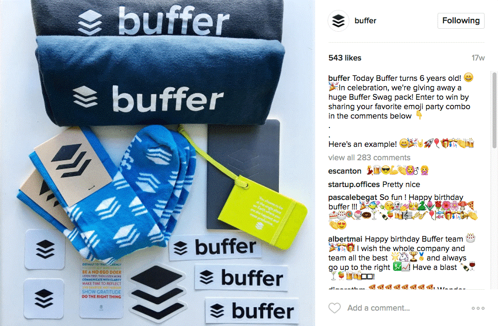 Задавать пользователям вопросы и призывать их к действию – способ не новый, но эффективный. И, конечно, никогда не забывайте про конкурсы. Все их любят.Команда Buffer, к примеру, опробовала следующие варианты: