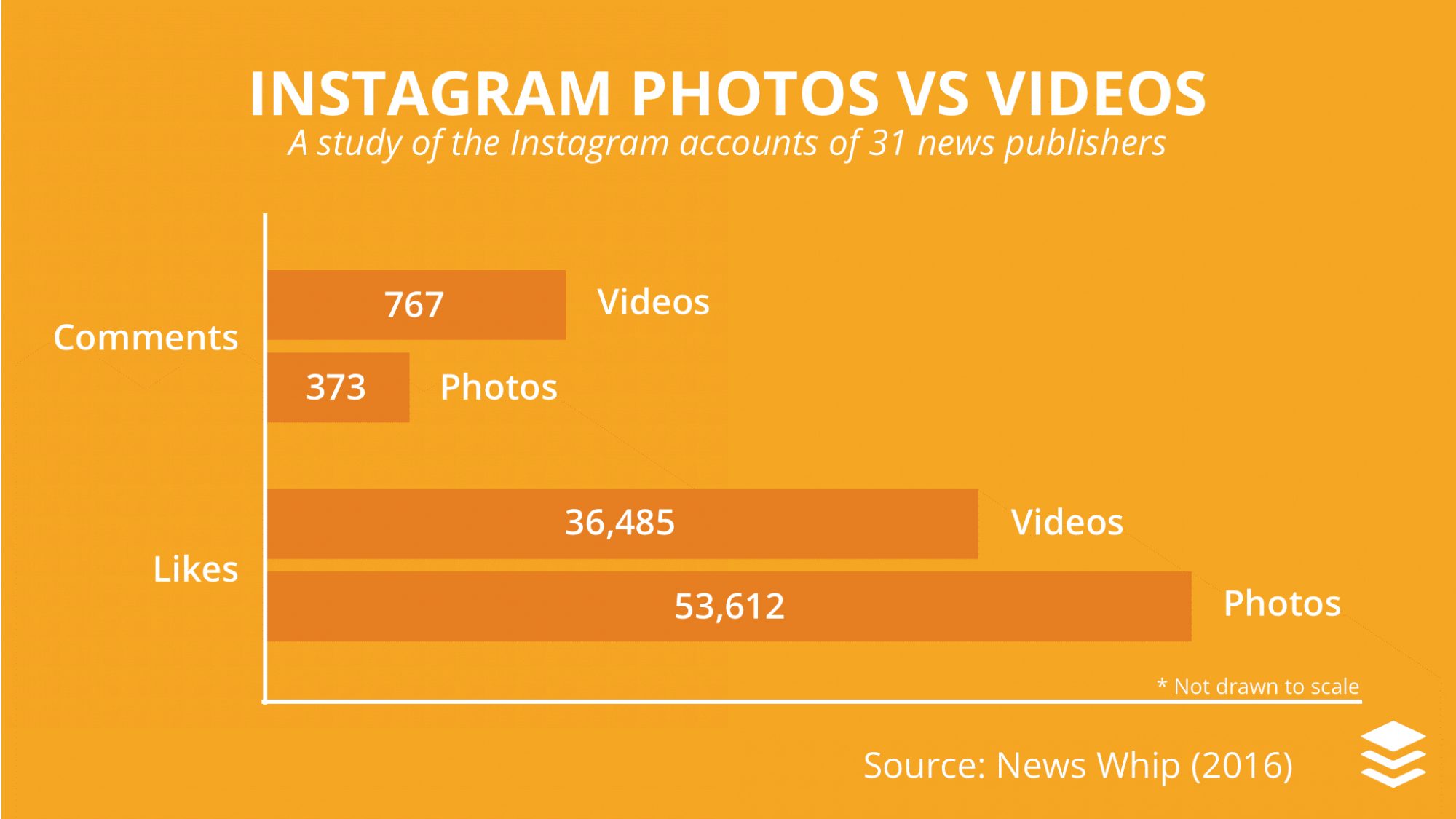 Результаты некоторых исследований показывают, что фото в Instagram получают больше лайков и комментариев, чем видео. На первый взгляд может показаться, что фото для вас будут предпочтительнее видео. Возможно, это так. Однако, если присмотреться к данным исследований внимательнее, можно заметить много интересного. Возьмем, к примеру, исследование News Whip, команда которого изучила Instagram-аккаунты 31 издания. Выяснилось, что фото действительно собирают больше лайков, однако видео гораздо чаще комментируют. В среднем, видео комментировали в два раза чаще, чем фотографии.Неизвестно, как алгоритм Instagram расценивает комментарии и отметки «мне нравится» – одинаково, или кто-то «перевешивает». Но, судя по тому, что комментарий требует от пользователя больших усилий, нежели лайк, можно предположить, что посты с большим числом комментариев будут ранжироваться выше.