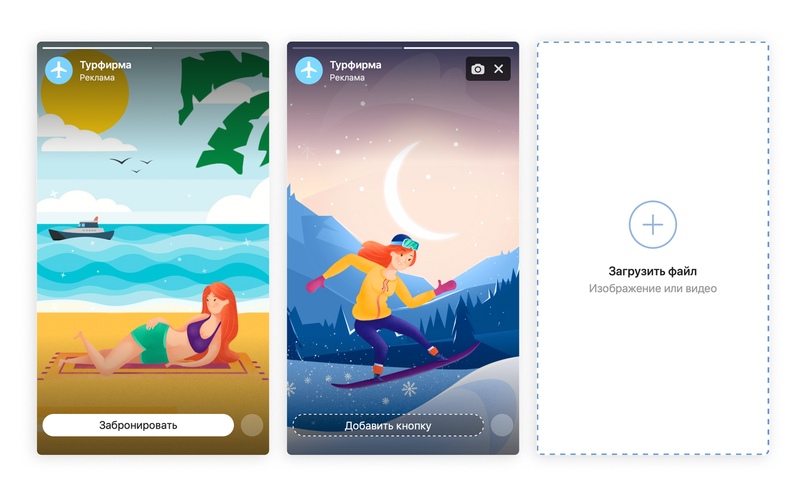 В одном объявлении может быть до трех фото или видео с CTA-кнопкой, ведущей на сайт или публикацию в соцсети. Для рекламы в «историях» доступны все настройки таргетинга, но ВКонтакте не рекомендует выбирать слишком узкую аудиторию, эффективнее всего новый формат работает в рамках охватных кампаний на широкую аудиторию.